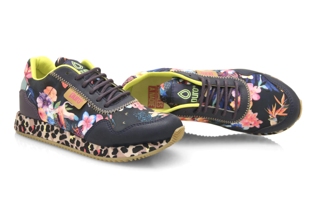 Disfrutá de la comodidad y el estilo único de la Zapatilla Retro Flow Esencia. Presenta base de goma forrada y estampada con suelín de caucho, puntera y cordonera sintéticas en azul, talón uva y verde metalizado, detalles de costura pespunte y zigzag, e interior forrado en sintético lima. Ideal para quienes buscan moda sostenible y conciencia ambiental.