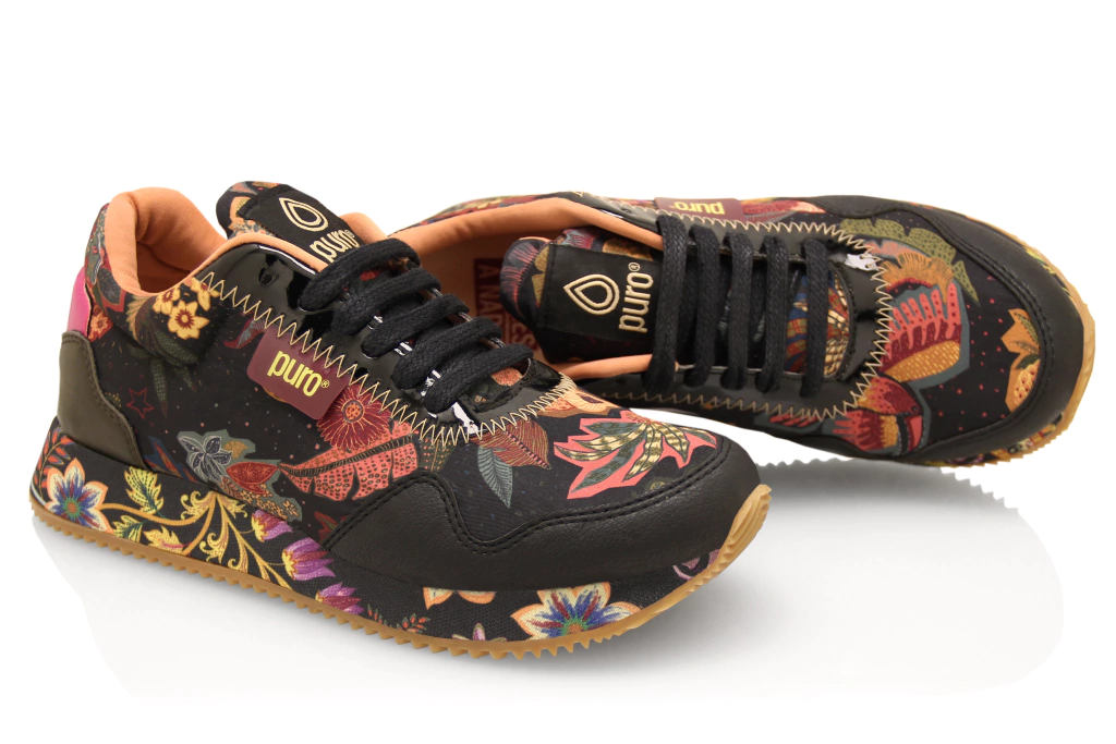 • Talón de sintético color oliva y fucsia.